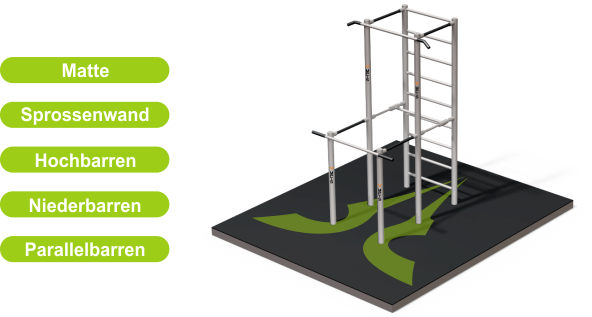 eine Sprossenwand, ein Hochbarren, ein Niederbarren und zwei